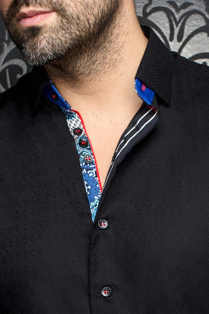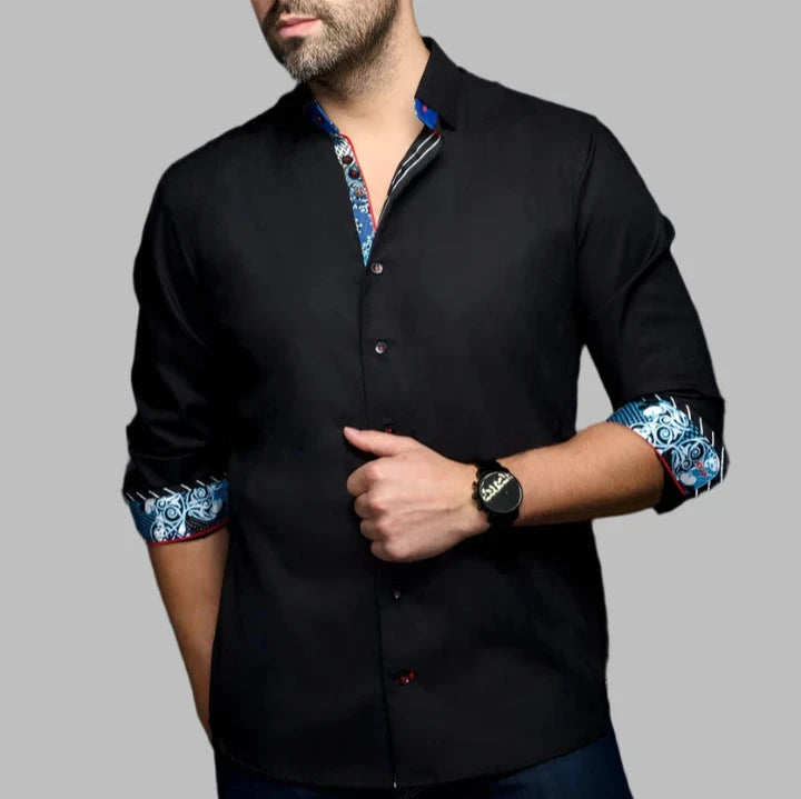 This premium stretch cotton woven shirt from Au Noir, the "Adjani", stands out with its elegant contrasting patterns and refined details. Stay comfortable and stylish in this long-sleeved option.