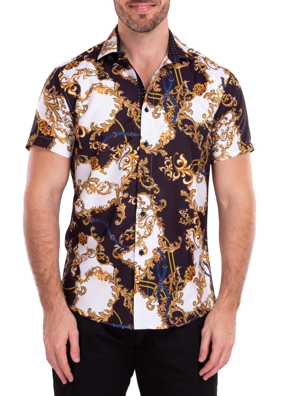 Introducing the BeSpoke Collection Button Down Fancy Print Shirt S/S in Black, a must-have addition to your wardrobe for those who appreciate style and elegance. This shirt combines sophistication with a touch of uniqueness, making it the perfect choice for any occasion.