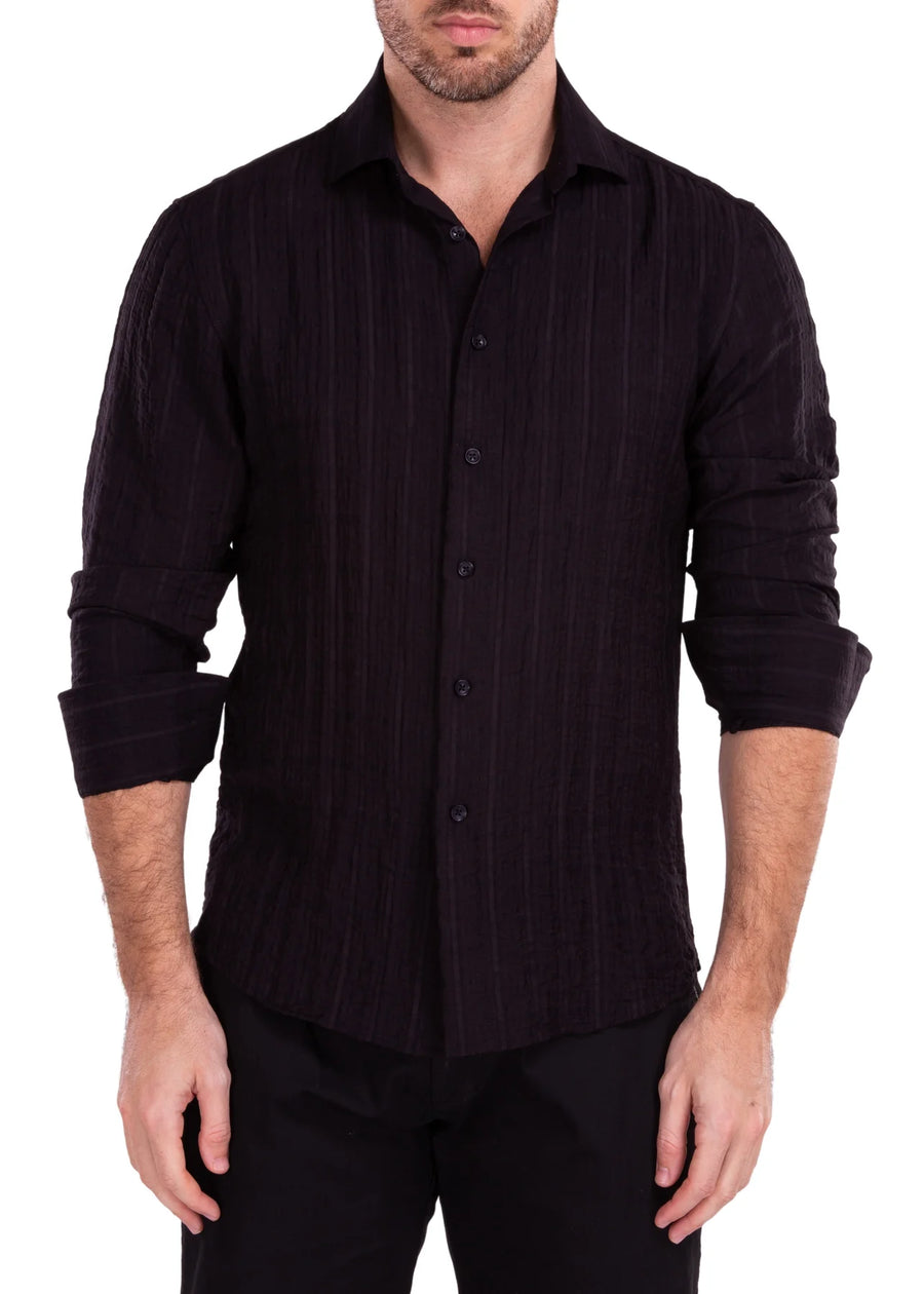 Elevate your style with our BeSpoke Mens Fancy Wrinkle Look Long Sleeve in Black! Made with BeSpoke craftsmanship, experience unparalleled comfort and sophistication in this long-sleeved shirt. Bring your wardrobe to the next level with this must-have piece.