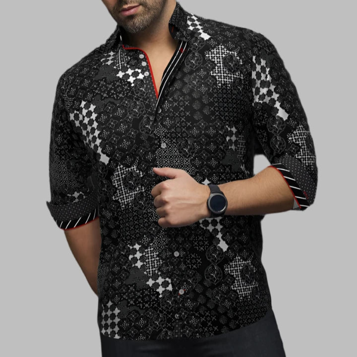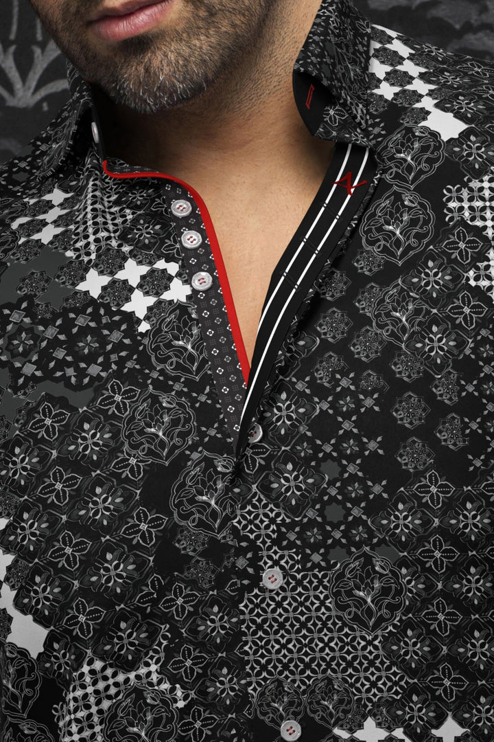 This black "Carlson" Woven Long Sleeve Sport Shirt by Au Noir is a must-have for those who want to be stylish and refined. The contrasting patterns and sophisticated details make this shirt stand out, while the premium stretch cotton fabric ensures comfort. Elevate your wardrobe with this exclusive and luxurious piece.