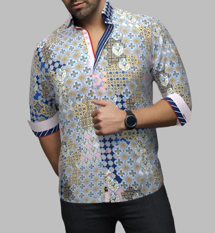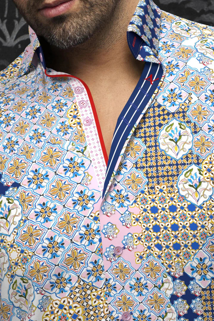 This pink "Carlson" Woven Long Sleeve Sport Shirt by Au Noir is a must-have for those who want to be stylish and refined. The contrasting patterns and sophisticated details make this shirt stand out, while the premium stretch cotton fabric ensures comfort. Elevate your wardrobe with this exclusive and luxurious piece.