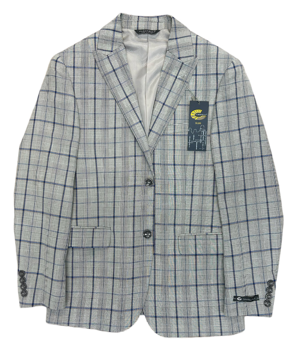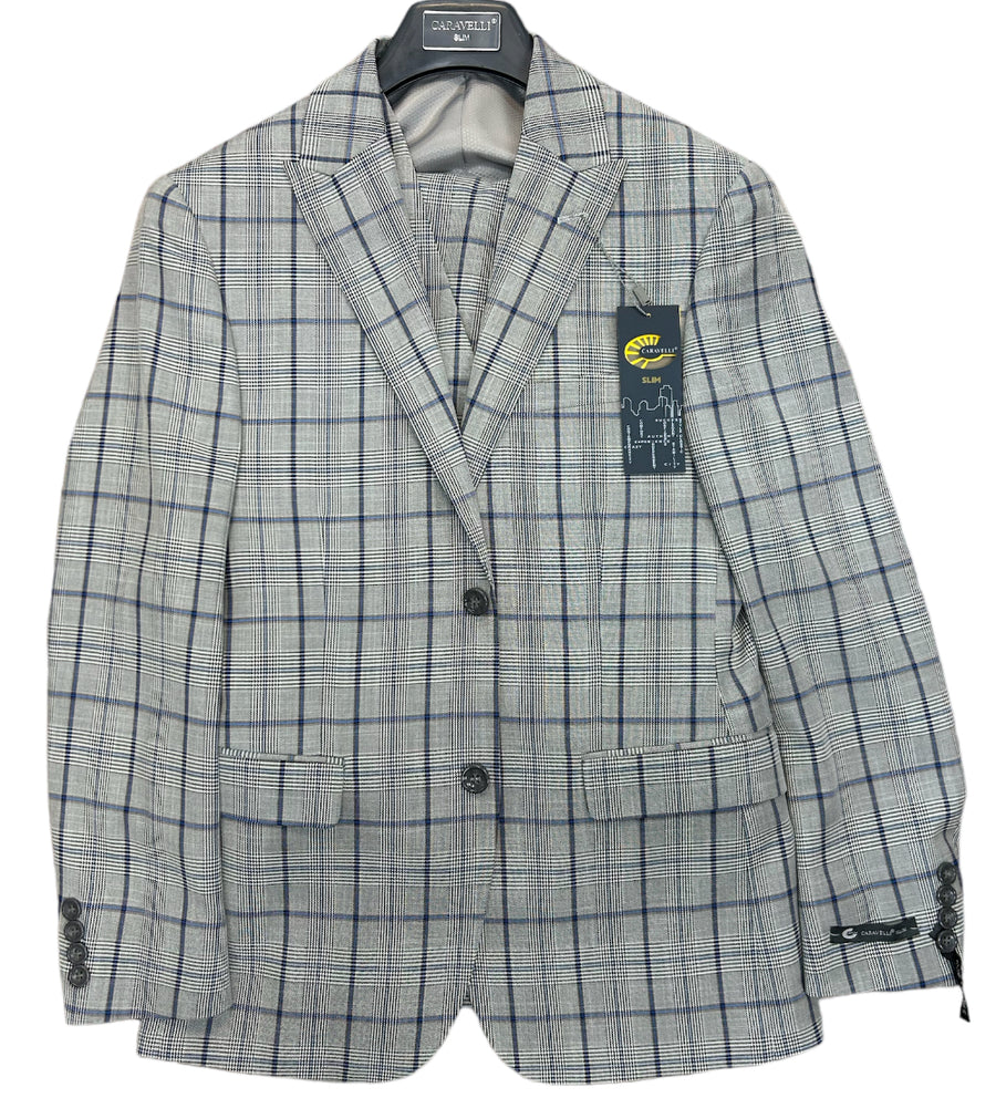 This stylish Caravelli suit features a slim-fit design and high-quality fabric, making it a must-have for any modern man. The classic windowpane pattern adds a touch of sophistication to any look. Upgrade your wardrobe with this 2-button, 3-piece vested suit in light grey.