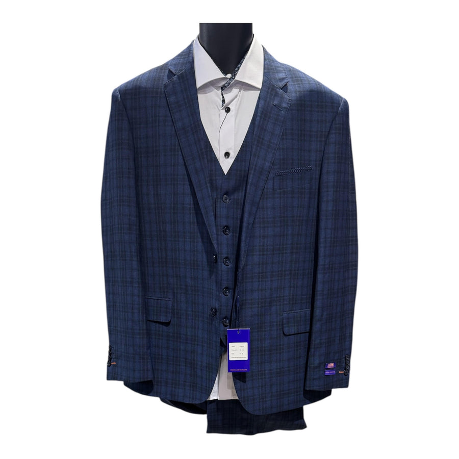 STEVEN LAND 3PC VESTED WOOL SUIT-BLUE PLAID