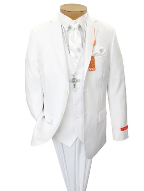 Give him the ideal First Communion look with the White Boy's Suit with matching pants. A boy's suit separate jacket by Tallia offers a memorable and traditional style. Offering a finished twist on traditional style, constructed from 70% poly/30% rayon, this boy's suit separate jacket will help him feel cutting-edge, clean, and comfortable, making it breathable for all-day use. This 2-button single-breasted, fully lined boys' suits separate jacket features a narrow lapel and side vents. There is a single exterior breast pocket, two hip flap pockets, two interior breast pockets, and a single interior accessory pocket for all his necessities. The pants feature a skinny fit, plain front, quarter top pockets, single button-thru besom back pocket, and button elastic waistband. For easy alteration, there is an unfinished bottom. T