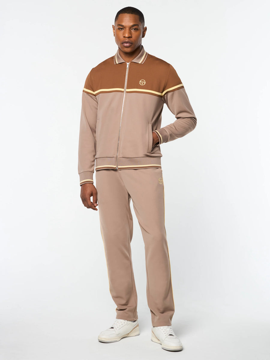 Elevate your style with the Sergio Tacchini "Olmi" Tracksuit in sophisticated taupe and grey. This premium set includes a jacket and pant, crafted with luxury in mind. Stay comfortable while making a statement in these exclusive pieces, perfect for any fashion-forward individual.